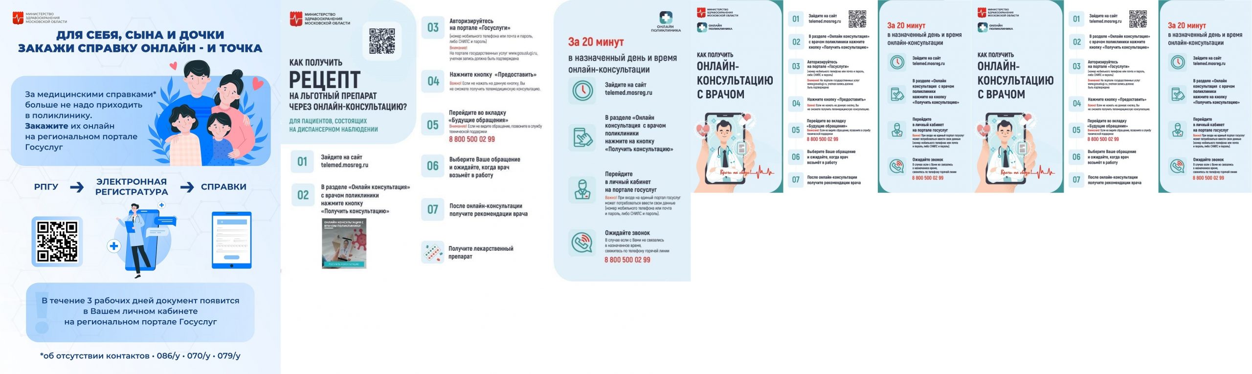 24.08.2022г. Во исполнении поручения Министерства жилищно-коммунального хозяйства Московской области, в рамках реализации Министерством здравоохранения Московской области на региональном портале государственных услуг электронного сервиса по получению 4 видов медицинских справок онлайн, а также записи пациентов на телемедицинские консультации размещаем информационные материалы.